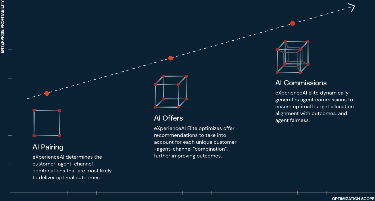 eXperienceAI offers the ability to optimally assign customers to agents and channels, putting your customers and your people at the heart of the decision. To maximize impact, we’ve incorporated further dimensions into eXperienceAI Elite with the addition of AI Offers and AI Commissions. Adding dimensions leads to more data, more granularity leads to more predictive AI models, which leads to better outcomes.